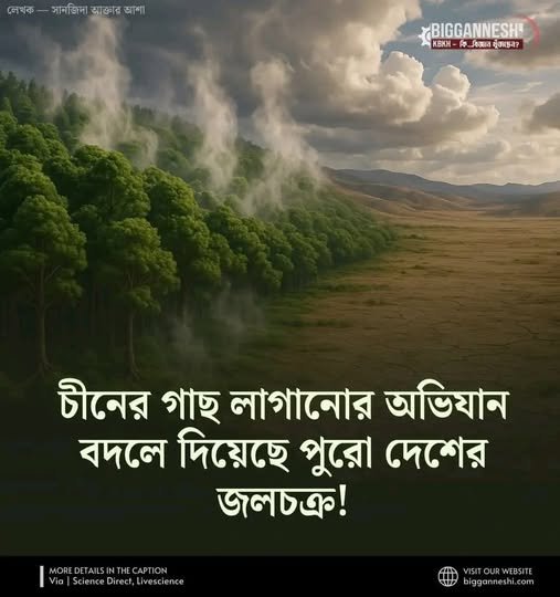 গত কয়েক দশকে চীন যেভাবে বন ফিরিয়ে আনার উদ্যোগ নিয়েছে, তা দেশটির জলচক্রকে এতটাই সক্রিয় করে তুলেছে যে পানি এখন এমন সব নতুন পথে সঞ্চালিত হচ্ছে, যা বিজ্ঞানীরাও আগে ভাবতে পারেননি। মরুকরণ কমানো, জলবায়ু পরিবর্তনের প্রভাব থামানো এবং মৃতপ্রায় ভূমিকে পুনরুজ্জীবিত করার লক্ষ্যেই দেশটি অসংখ্য গাছ লাগিয়েছে এবং নষ্ট তৃণভূমিকে পুনর্গঠন করেছে।